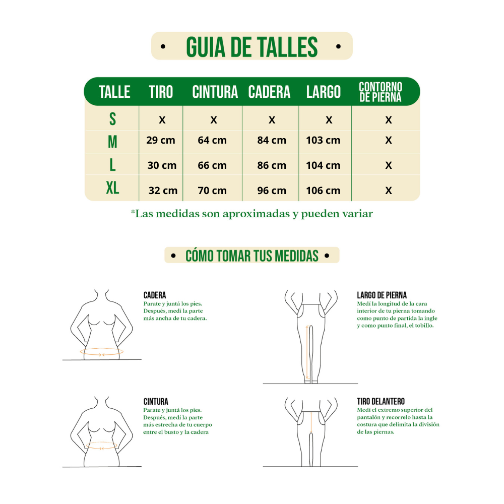 Es tiro medio con elástico en la cintura, se adapta al cuerpo. El calce es al cuerpo en la parte superior y oxford en la botamanga que estiliza y alarga la silueta.