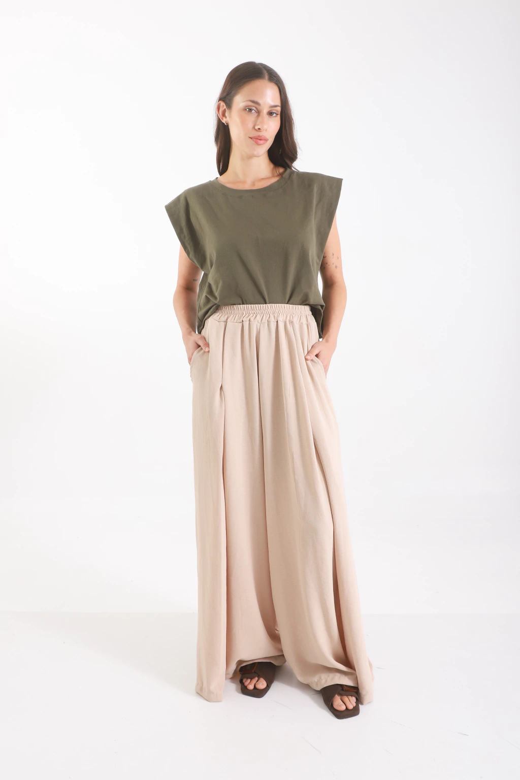 Palazzo super ancho. Tiene tabla frontal que se abre al caminar generando una amplia caída en la tela.