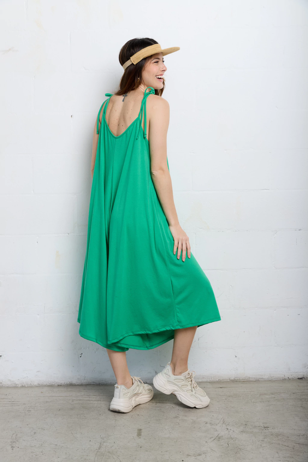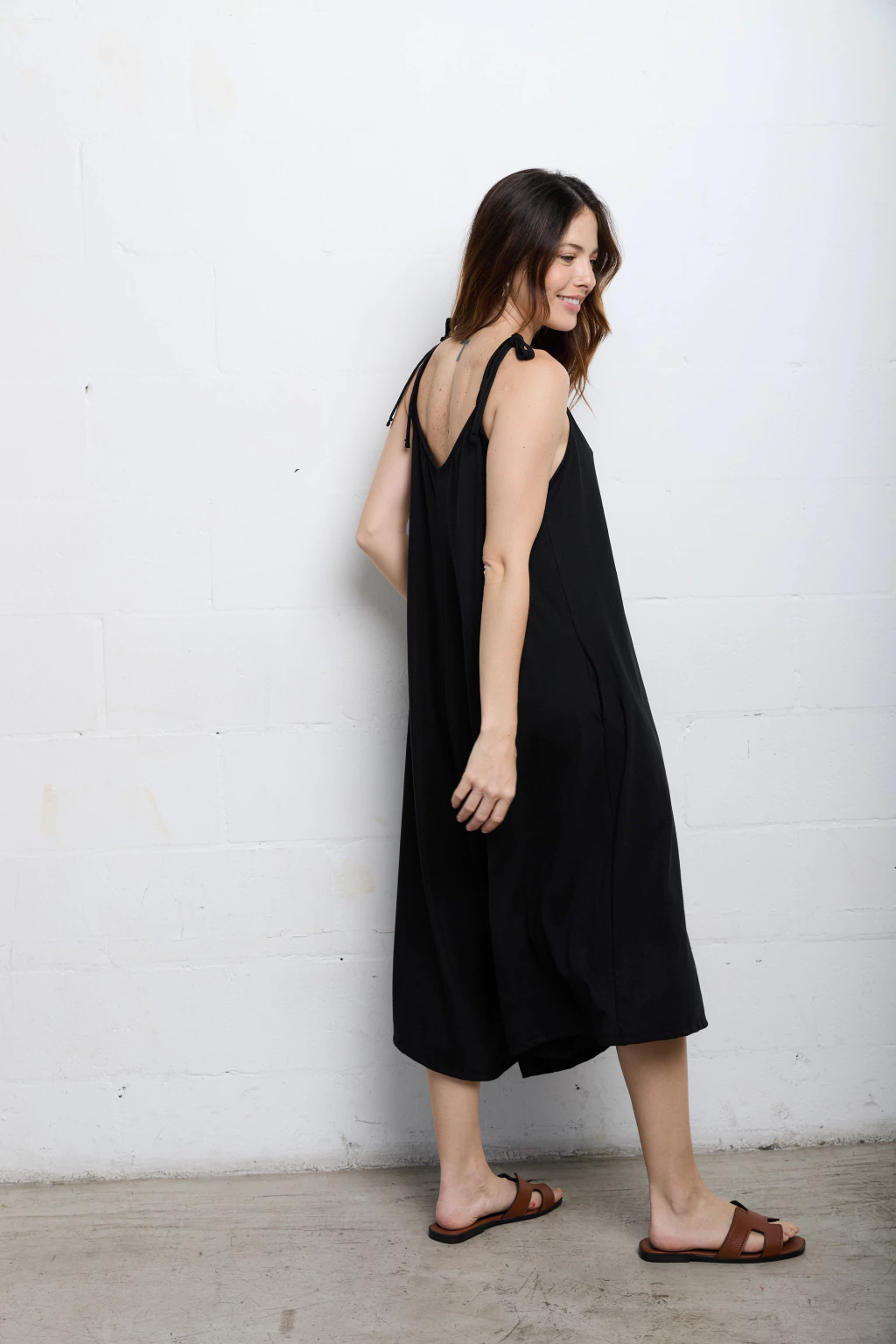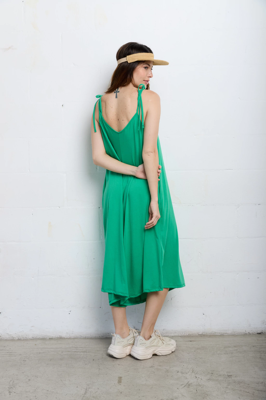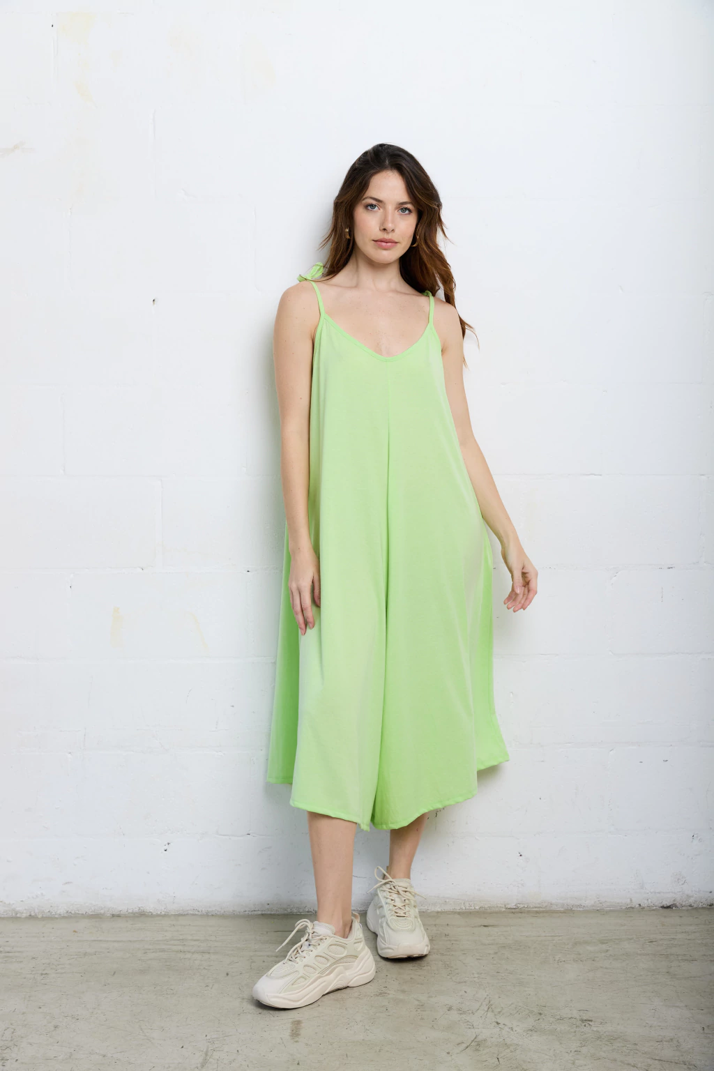 Mono escote en v adelante y atrás. Tiene breteles para atar y regular como quieras.