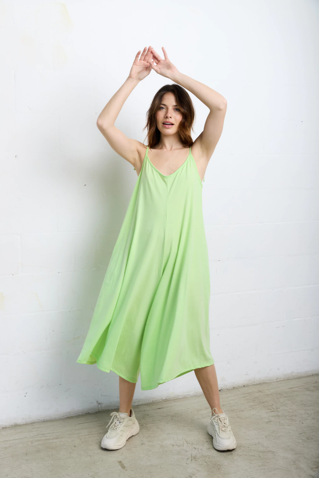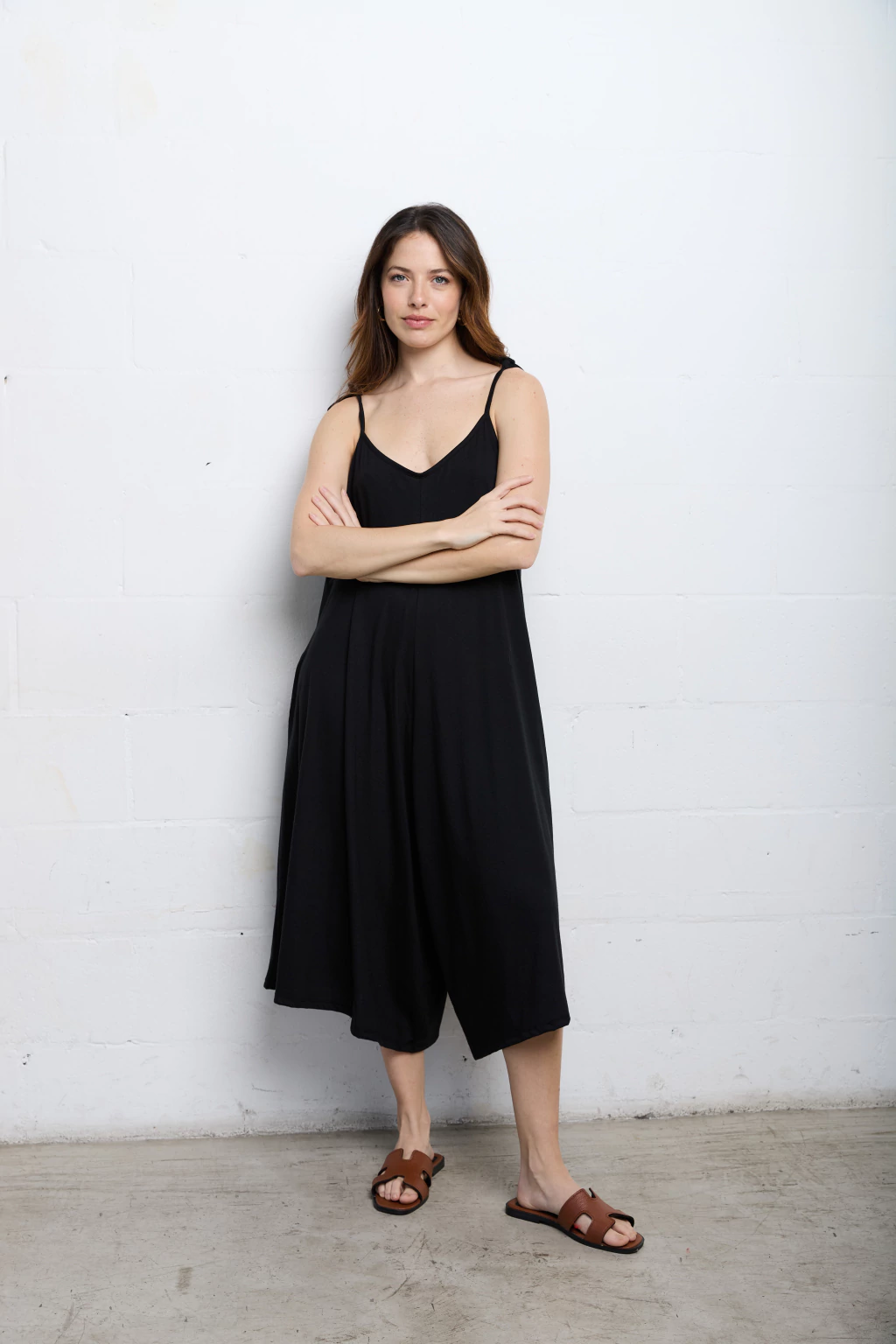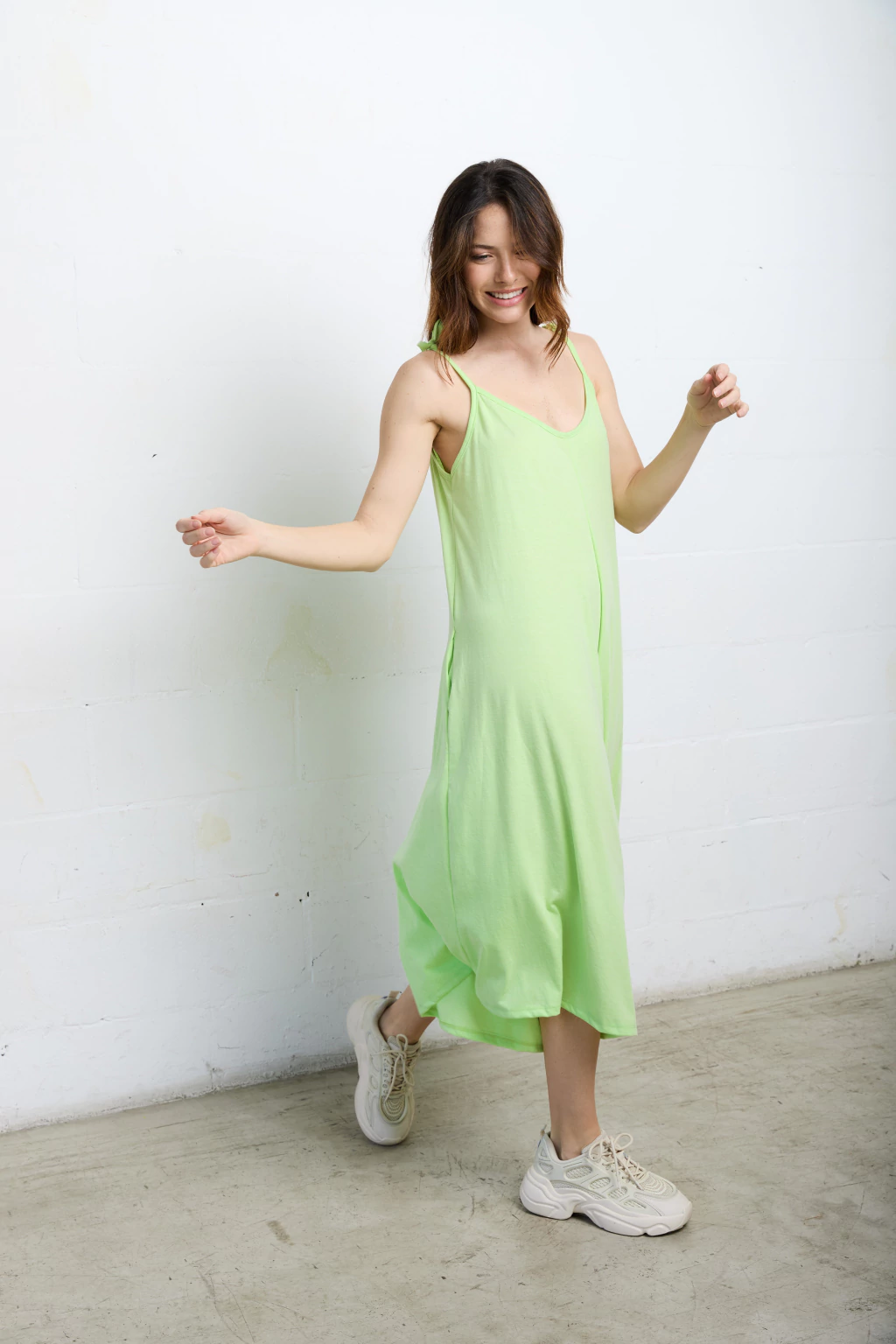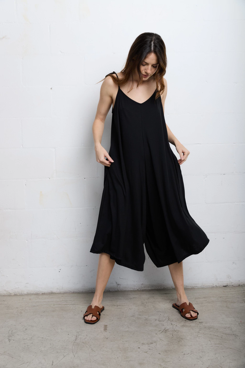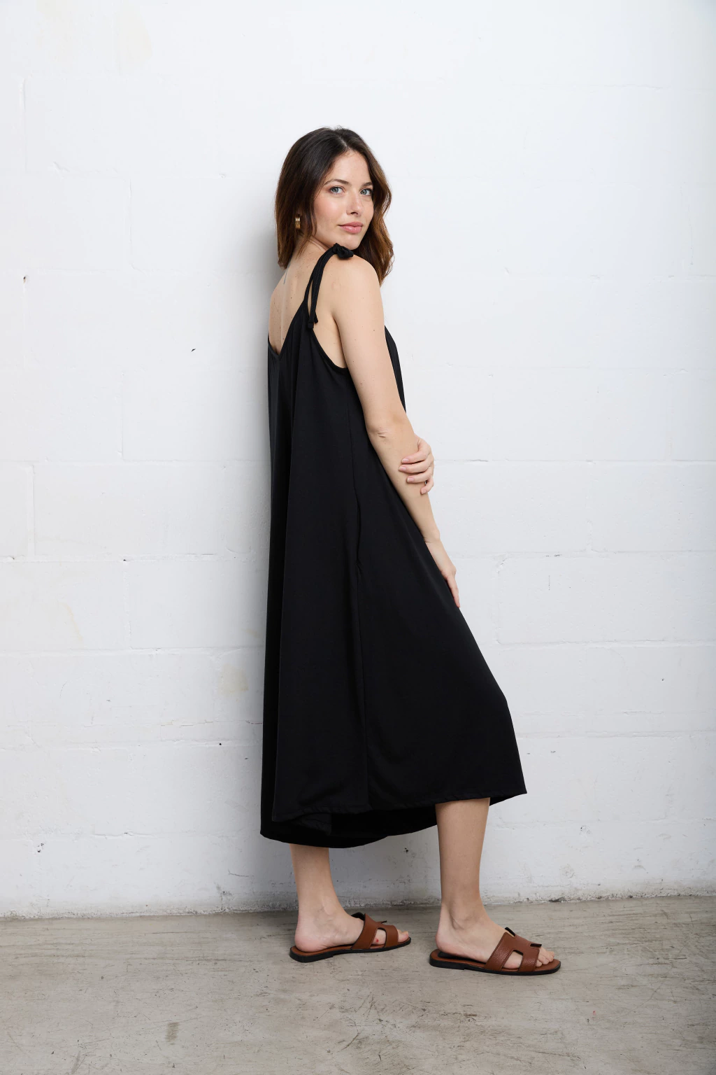 Mono escote en v adelante y atrás. Tiene breteles para atar y regular como quieras.