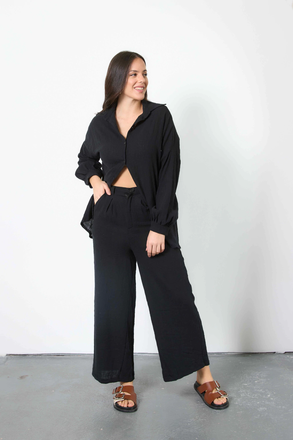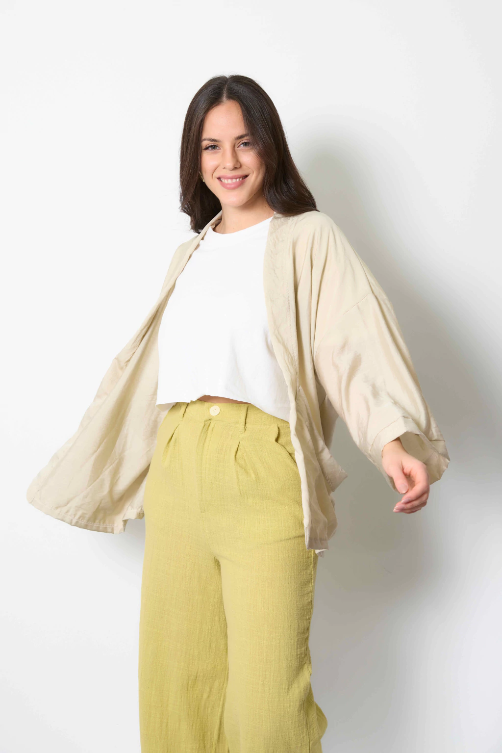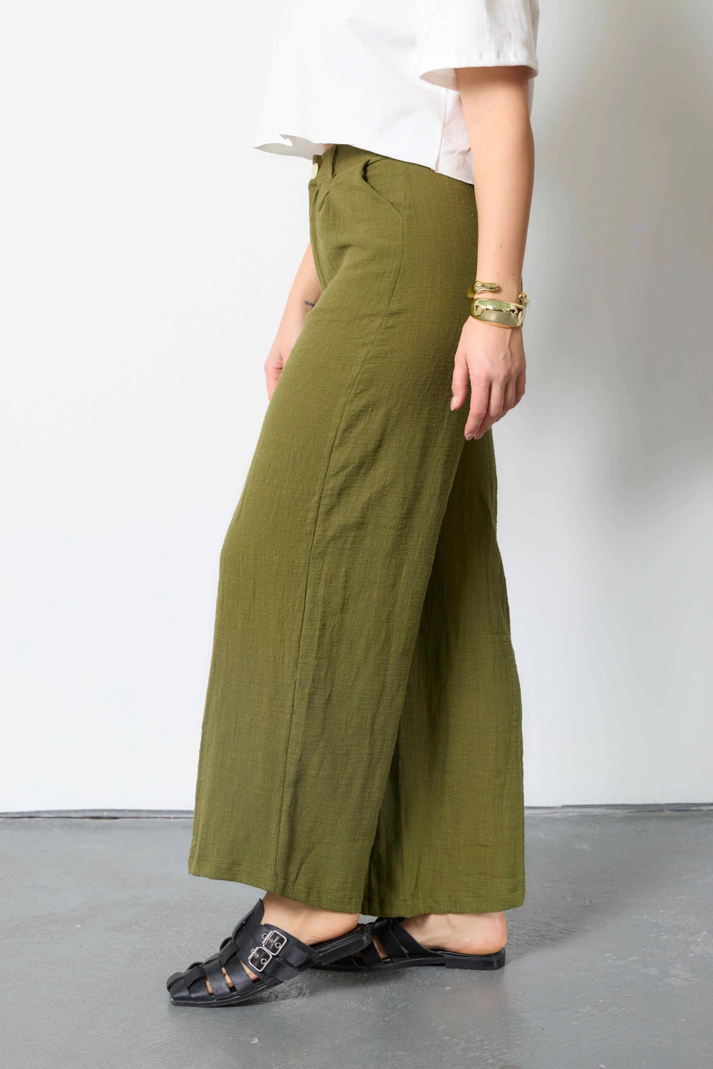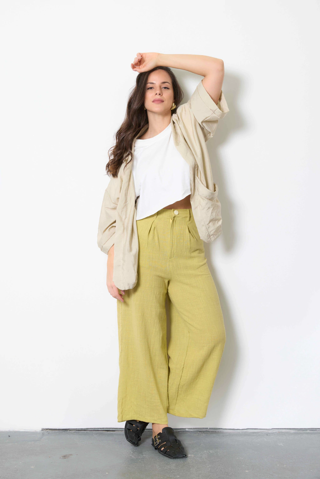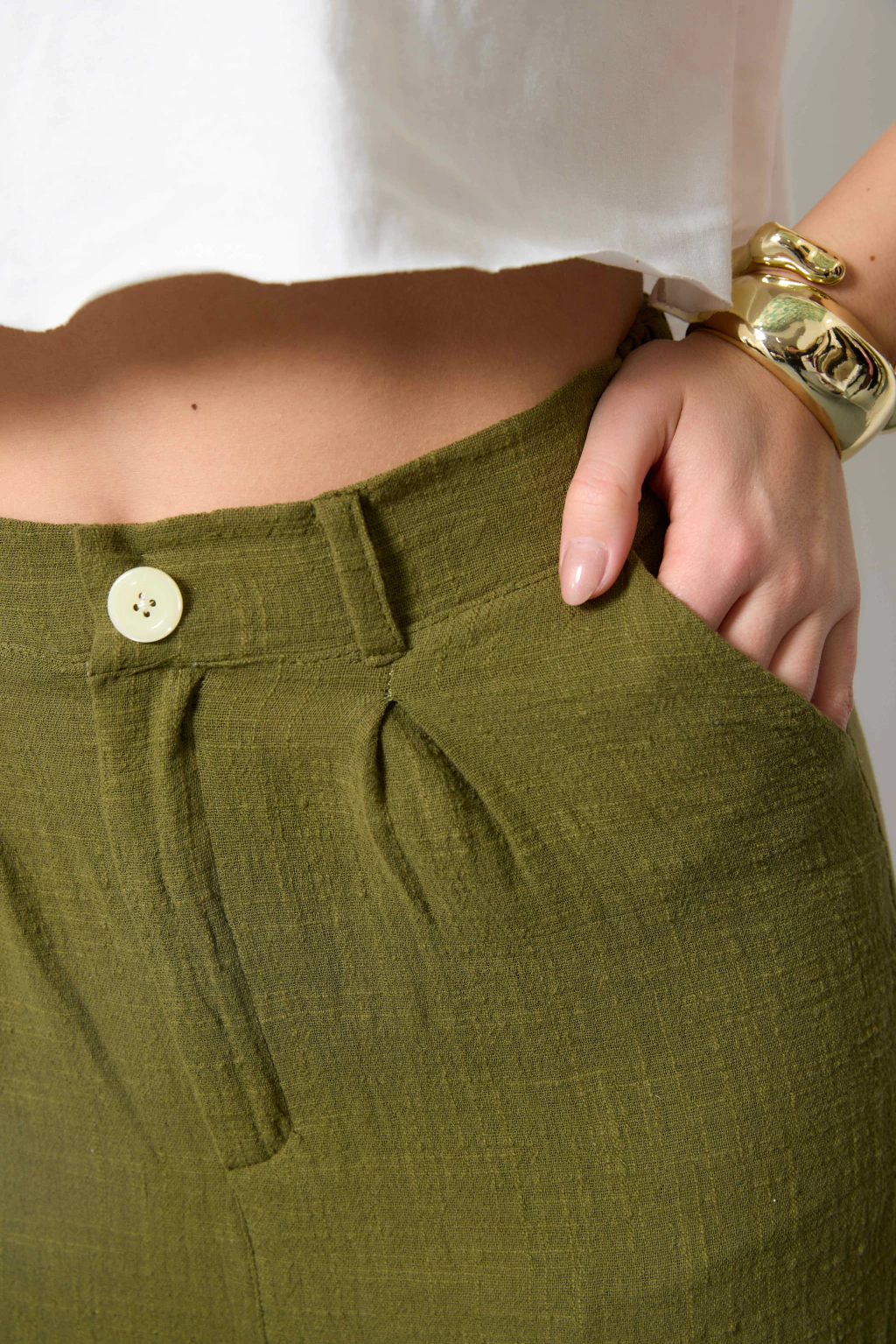 Pantalón con pinzas delanteras, pasacinto, cierre y botón. Confeccionado en lino de algodón.