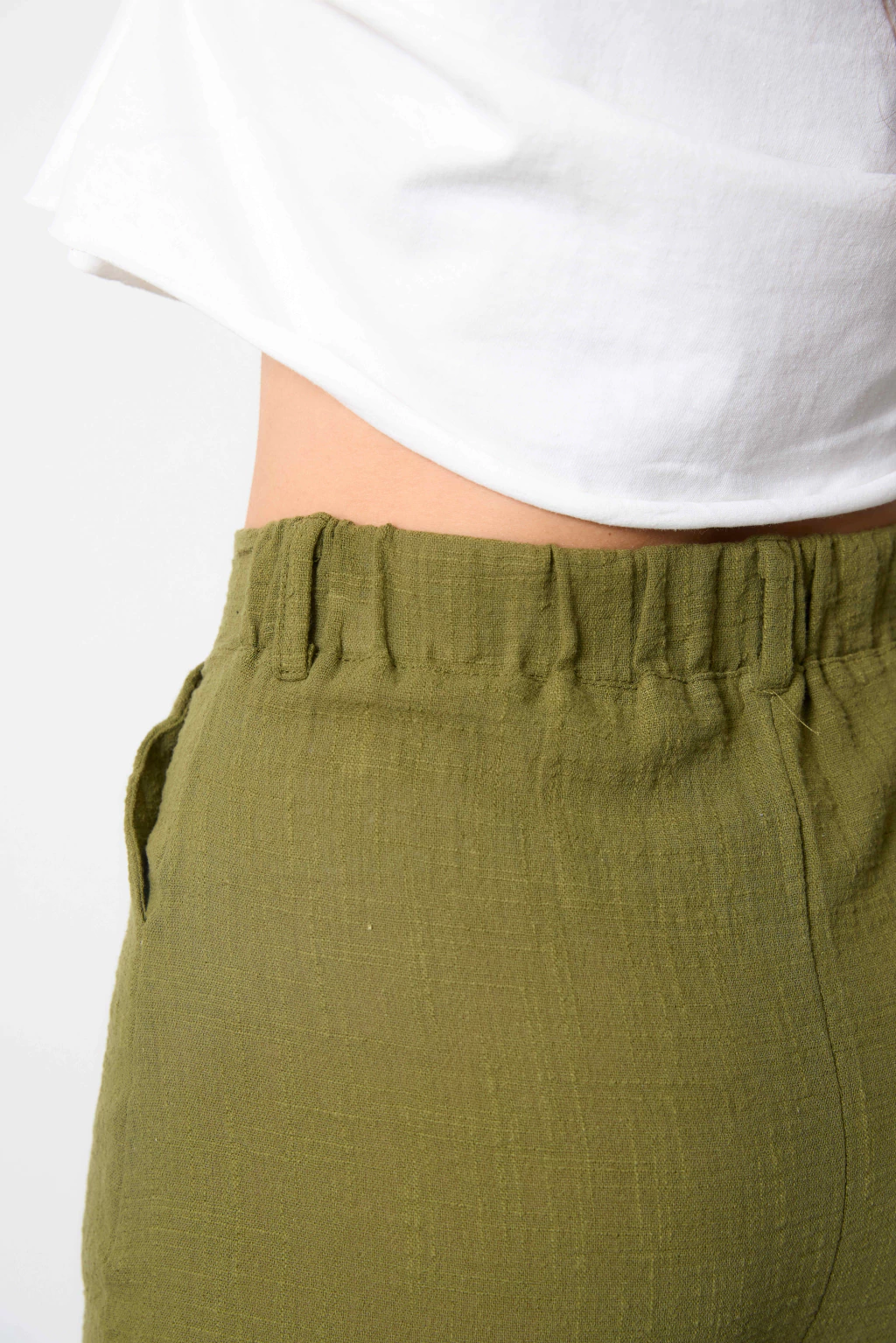 Corte recto. Tiene elástico en la parte de atrás de la cintura para un calce más cómodo.