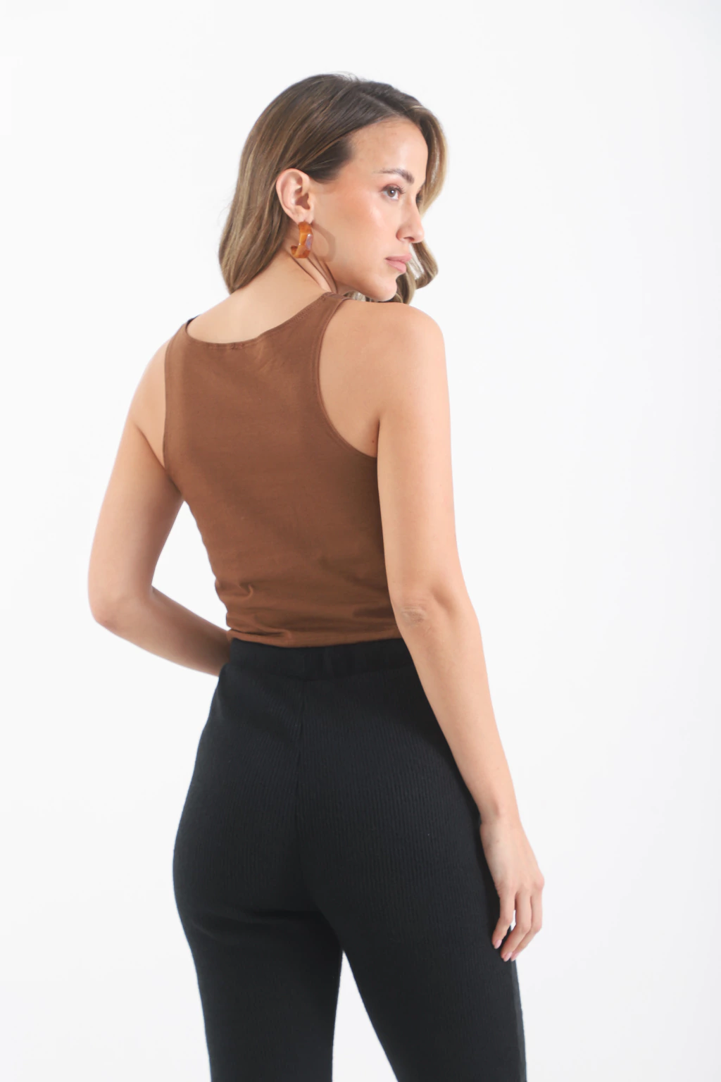 Top combinado. El delantero es de simil cuero y la parte de atrás es de algodón.