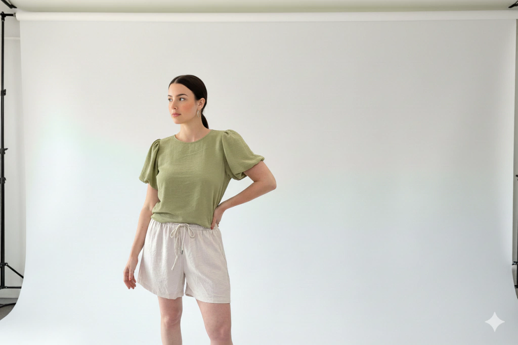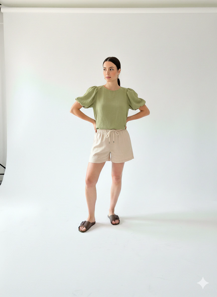 Remera escote redondo. Tiene mangas tipo balloon que simulan volumen.