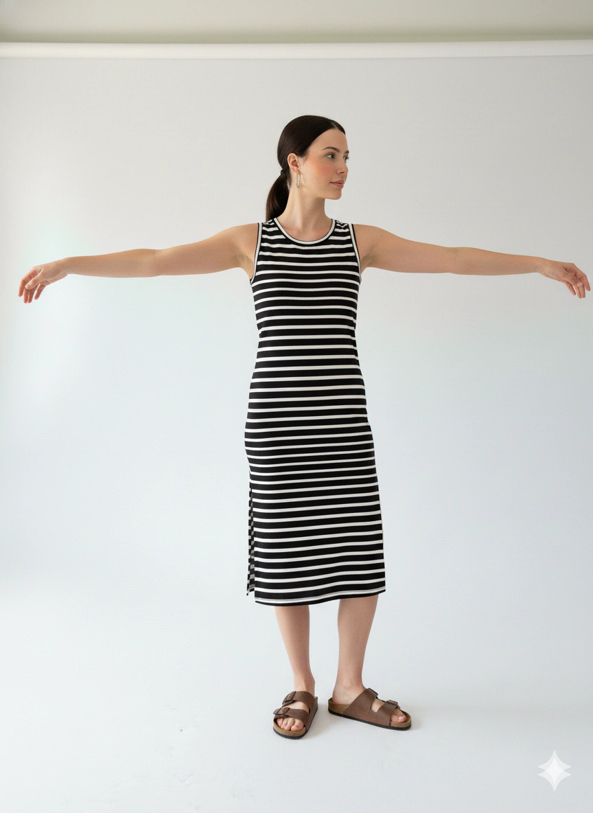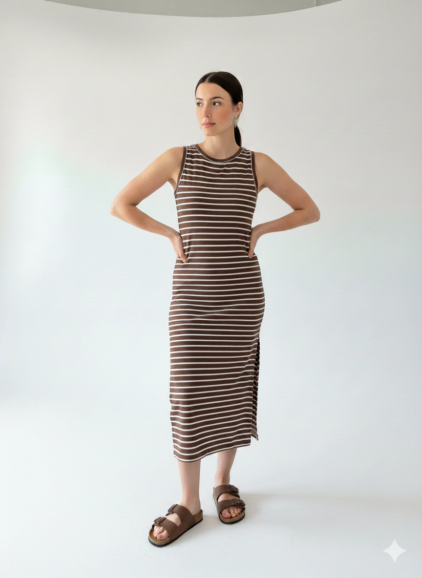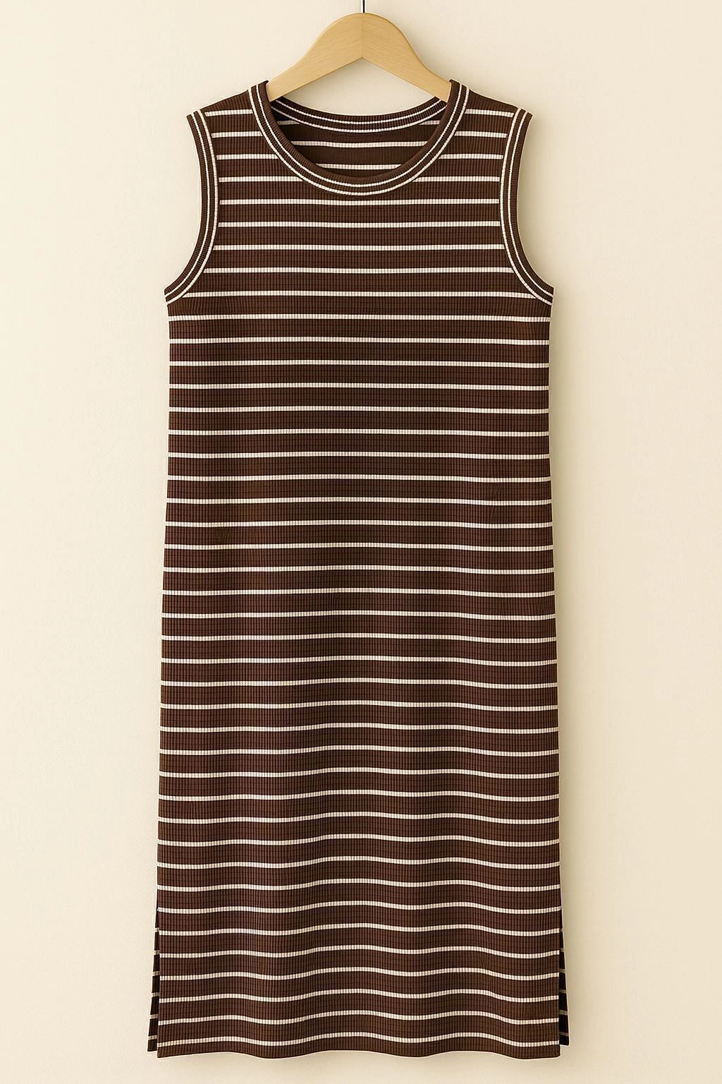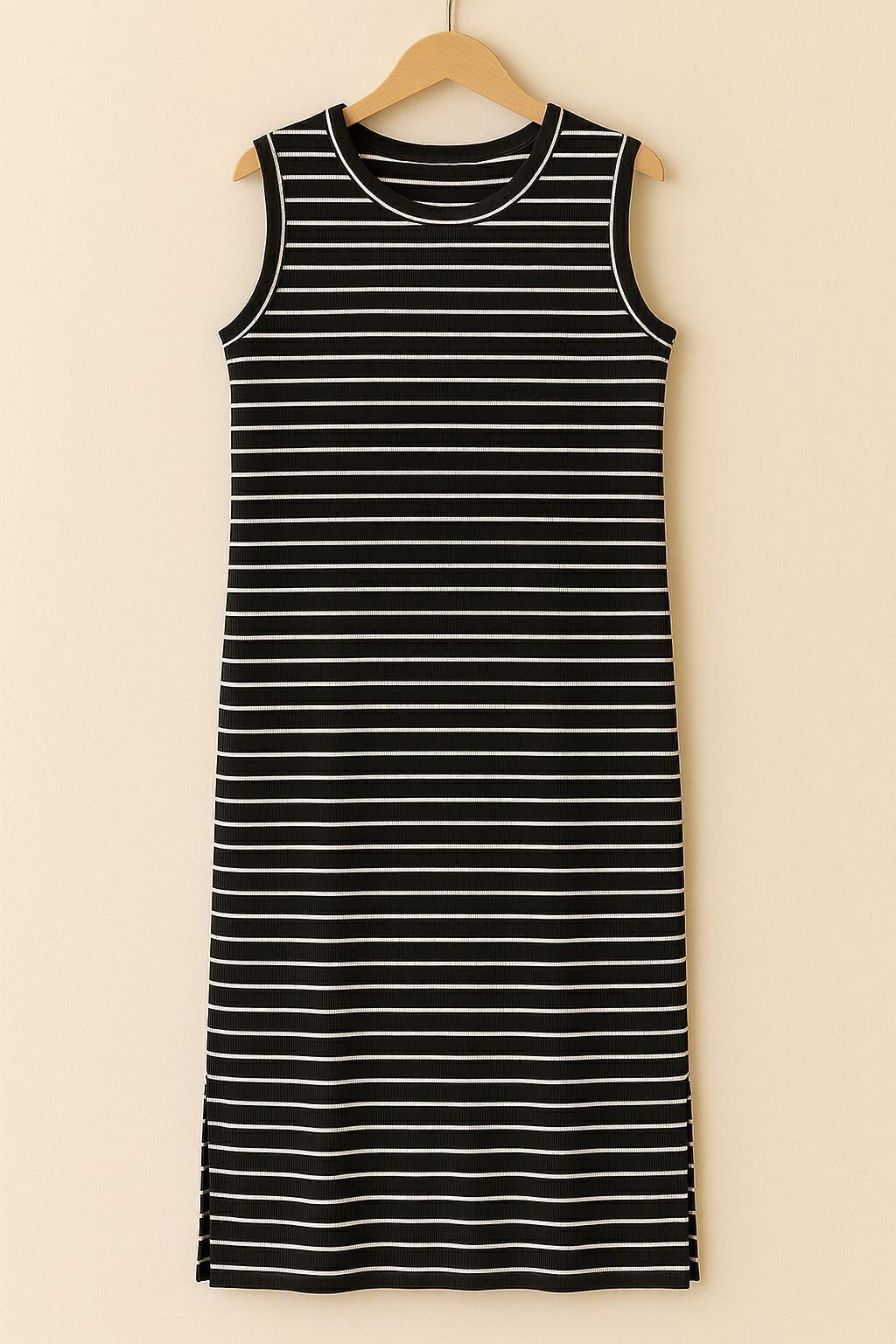 Vestido sin mangas. Tiene cuello redondo. Rayas horizontales.