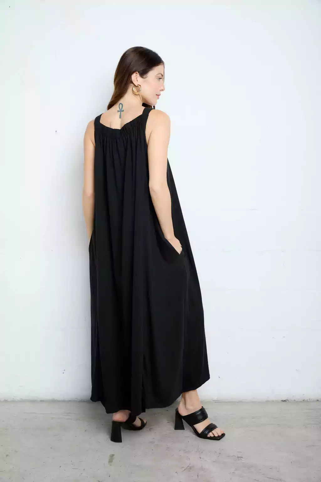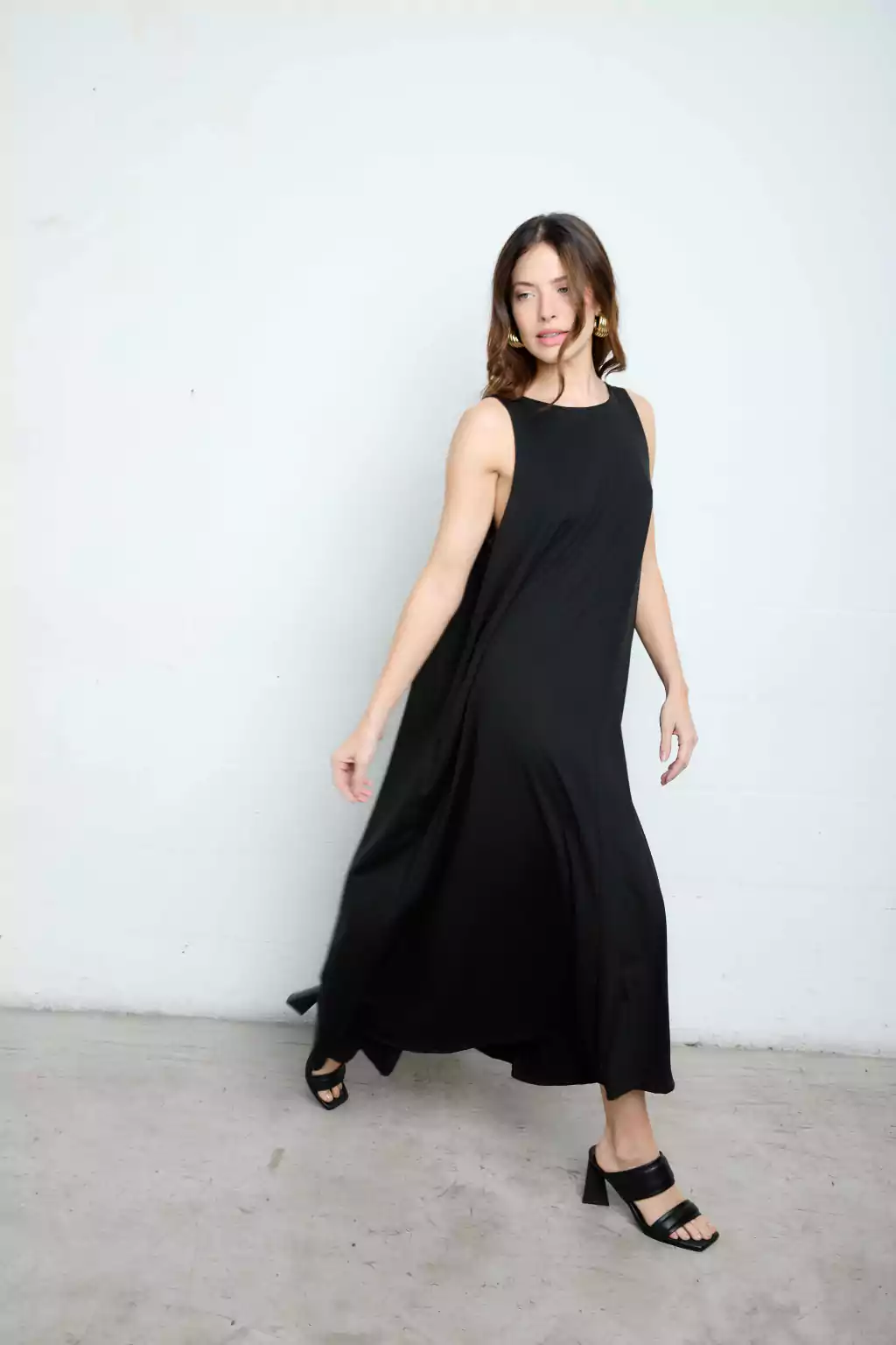 Vestido largo musculosa corte trapecio. Tiene bolsillos. Tiene elástico en la espalda.